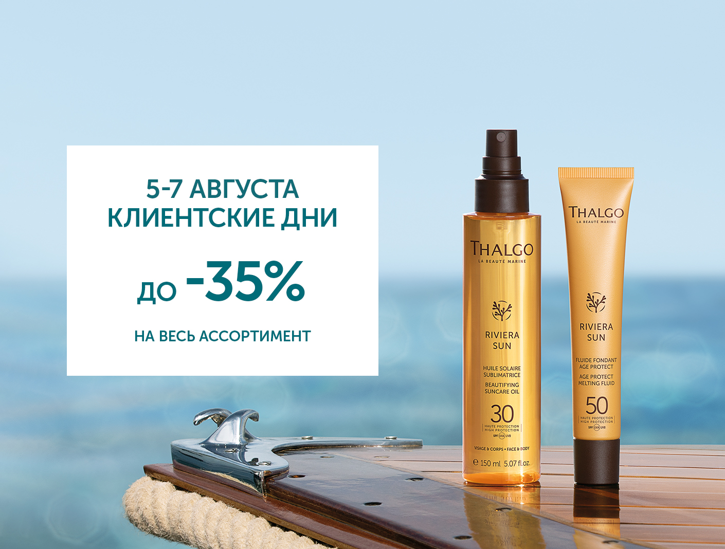 Дорогие клиенты! Мы рады сообщить вам о грандиозной акции — клиентских днях в официальном интернет-магазине Thalgo. С 5 по 7 августа мы предлагаем вам уникальные скидки до 35% на весь ассортимент наших товаров.