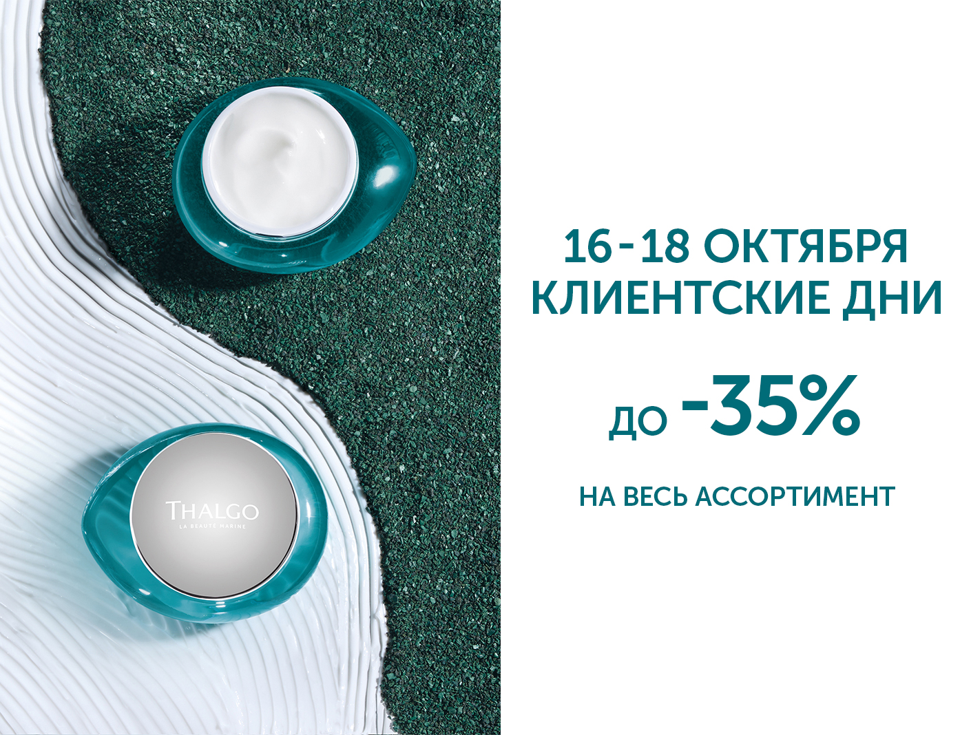 Осень — время обновлений и приятных сюрпризов! В честь приближения золотой поры и в благодарность нашим любимым клиентам интернет-магазин Thalgo объявляет о проведении специальных клиентских дней с 16 по 18 октября. В течение этих трёх дней вас ждёт уникальная возможность приобрести всю продукцию Thalgo со скидкой -35%. Это ваш шанс побаловать себя и своих близких качественной косметикой по привлекательной цене.