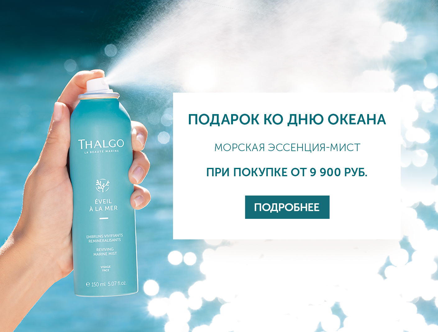 При покупке от 9 900 рублей вы получите эксклюзивный подарок — оживляющий морской спрей-клеточный восстановитель Eveil a La Mer объёмом 150 мл.