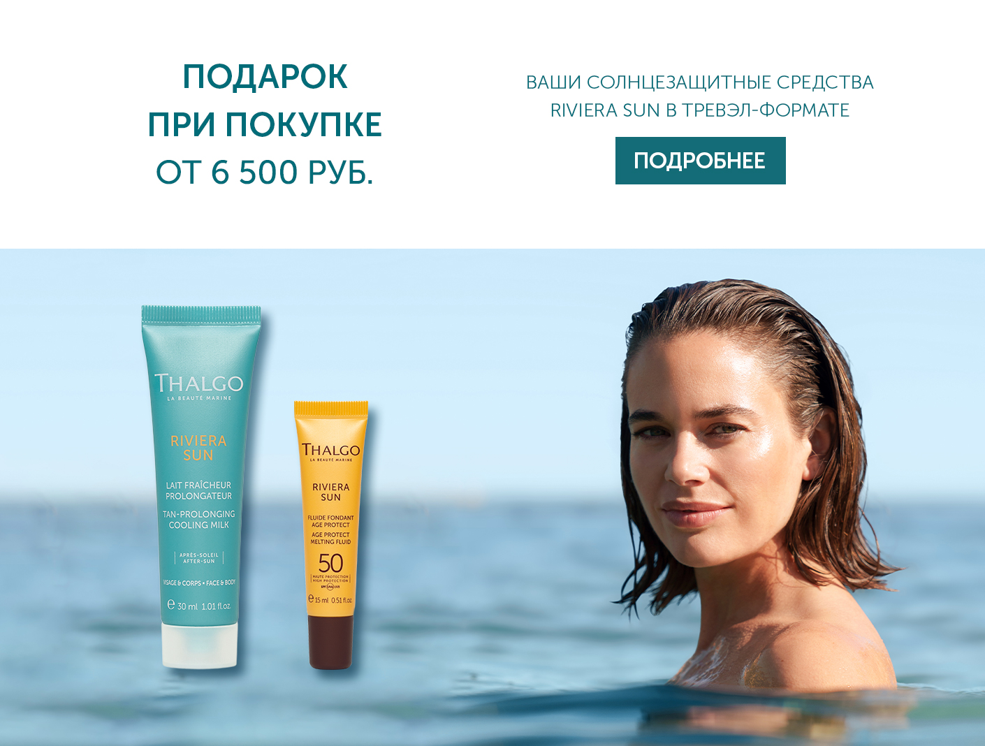 Только в июне, совершая покупку в нашем интернет-магазине на сумму от 6500 рублей, вы получите в подарок солнцезащитные средства Riviera Sun в тревэл-формате от французского бренда Thalgo!